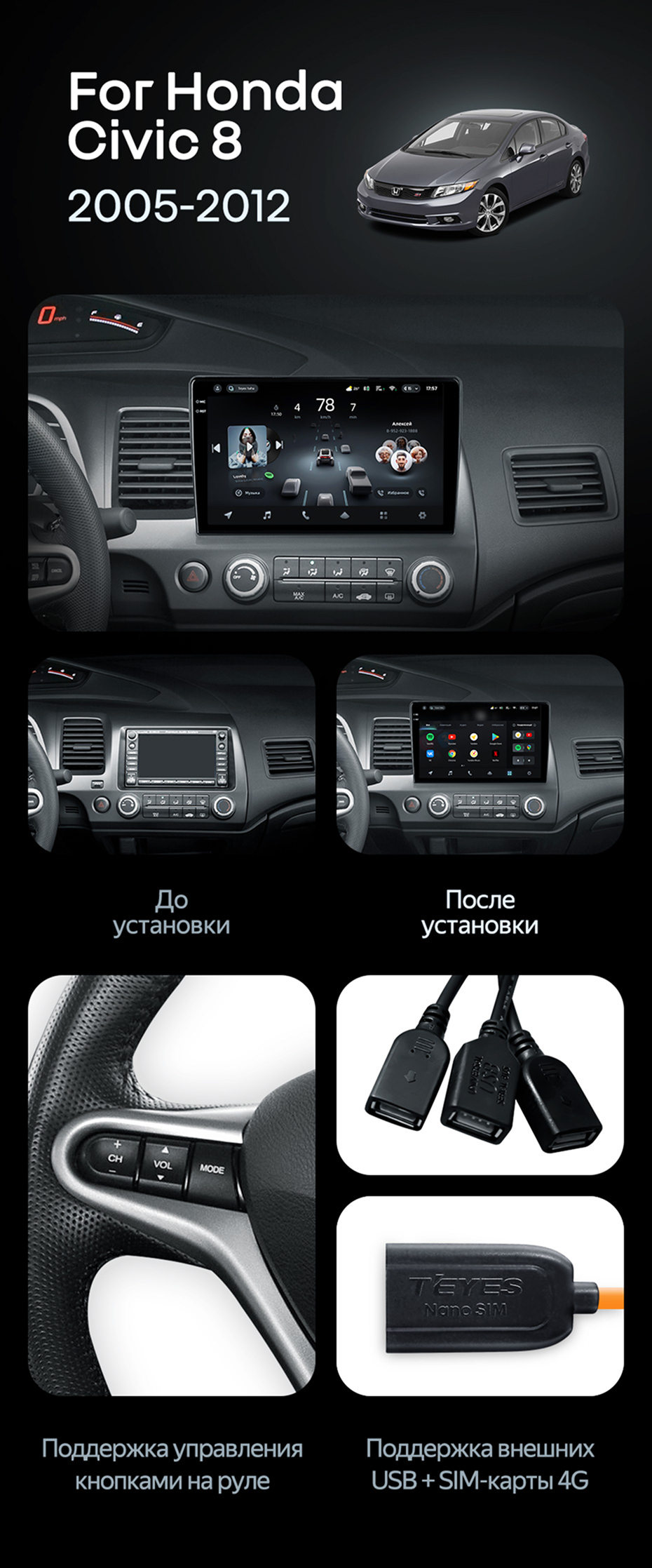 Штатная магнитола Teyes CC4 Pro 8/128 Honda Civic 8 FK FN FD (2005-2012) - купить всего за 65 600 руб. в интернет-магазине в Тольятти Teyes.com.ru. ✓ Самый лучший выбор мультимедиа ✓ Лучшая замена штатному ГУ ✓ Тел. +7 (800) 775-31-74